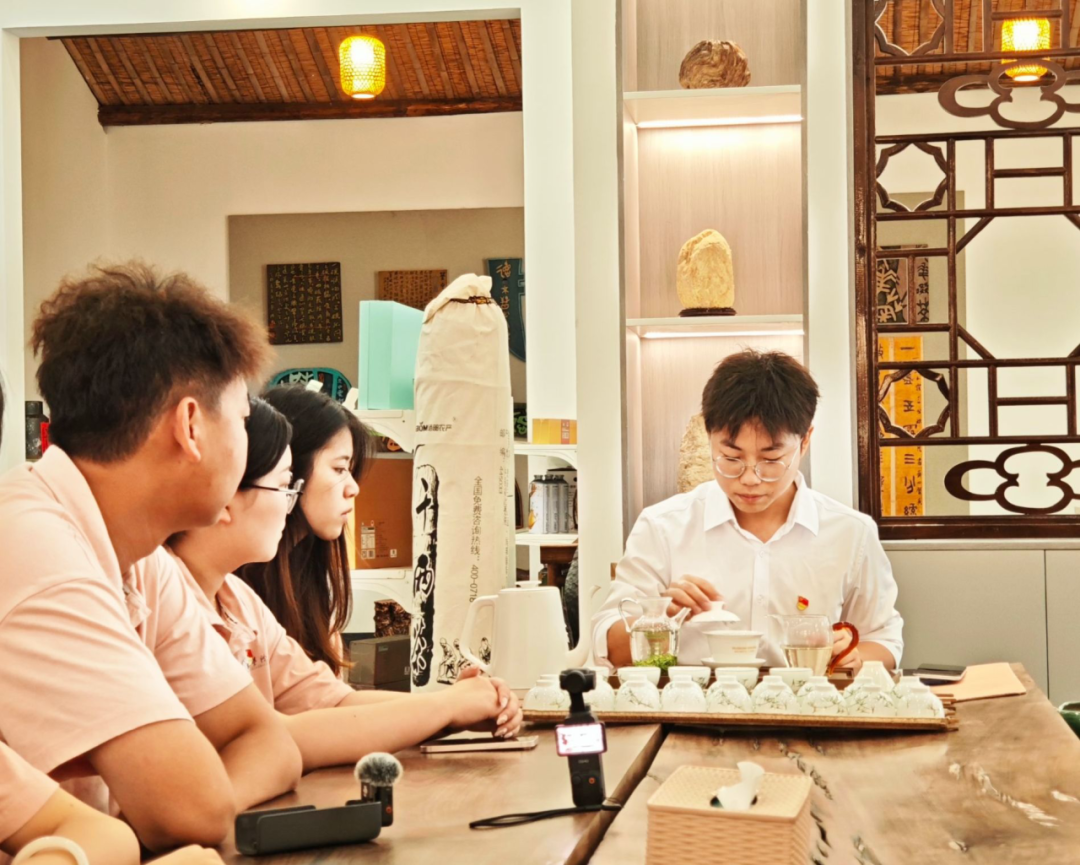 博物馆的茶室里,茶艺师分别用盖碗冲泡、上投法两种方式冲泡恩施玉露。盖碗冲泡时,沸水注入的瞬间,茶艺师手腕轻旋,茶叶在碗中翻滚舒展,茶汤渐呈浅绿。实践团队员们品茗时,尝到的不仅是茶香,更有老茶人“守艺”的执着。恩施玉露的“三绿”是其标志性特点,即干茶翠绿、茶汤碧绿、叶底嫩绿,这一特色源于其独特的蒸青工艺和精细制作流程。而用上投法泡制恩施玉露,既能保全“三绿”特质,又能释放纯正风味。“三绿”不仅是恩施玉露外在品质的直观体现,更承载着其千年蒸青工艺的精髓,彰显着“守艺不守旧”的文化传承底气。此刻,实践团成员忽然明晰:文化自信,既在古法的坚守里,也在新派的创新中