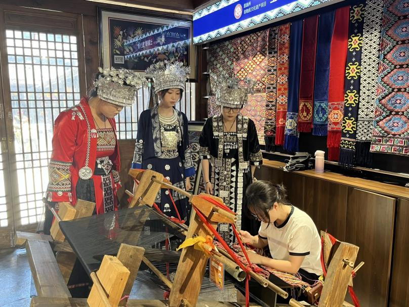 西兰卡普传承基地的织机前,国家级传承人田若兰的手指在经纬线间穿梭,梭子如银鱼般游动。“这‘四十八勾’图案,勾与勾要‘像手拉手,不打架’,”她指着织锦让实践团成员看,“你看这绿色勾边,要比红色深半分,才显得有精神。”