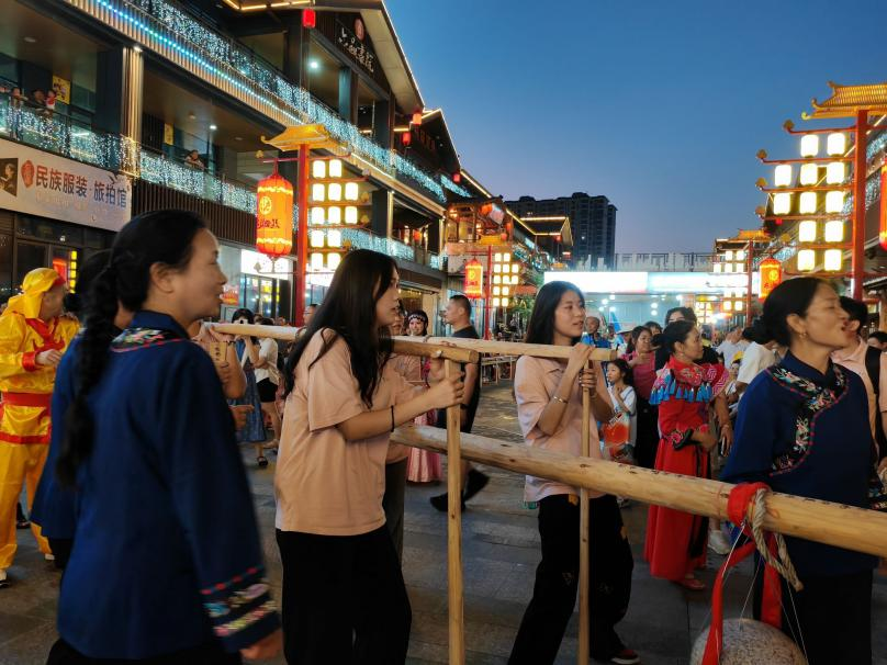 清晨的土家女儿城,薄雾漫过青石板路,吊脚楼的飞檐在晨光中划出优美的弧线。实践团成员穿过“世间男子不二心”牌坊,恰逢民俗广场的土家族婚俗表演开场。“新郎”骑着高头大马,“新娘”身着华丽的土家族婚服,在媒婆的引导下完成一系列传统仪式。表演结束后,实践团成员与演员们交流,了解到土家族婚俗中“哭嫁”等独特习俗的历史渊源和文化意义,认识到这些习俗不仅是一种仪式,更是土家族女性表达对父母养育之恩的情感载体。