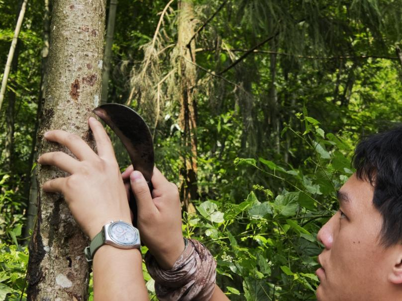 坝漆工坊内,非遗传承人邓老师展示“V”形割漆法:“蚌壳接漆要‘仰角30度’,多一分漏,少一分接不满。”实践团成员尝试用葫芦髹漆,实践团的何同学手一抖,漆液在木坯上晕成了团。“这不碍事,”邓老师指着晕染的纹路,“有时候歪打正着,倒像山里的云。”