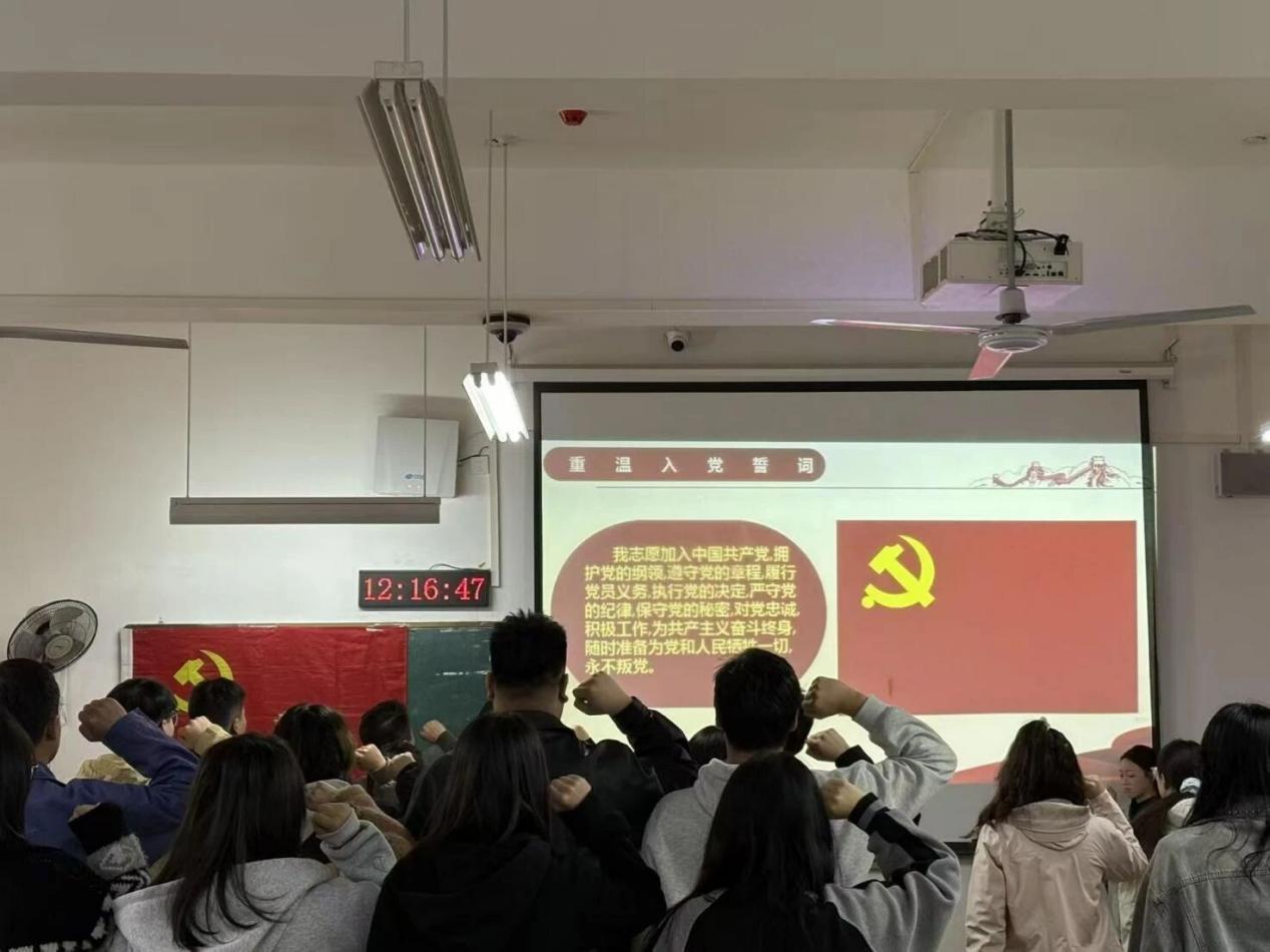 会议开始,文宇良同志通报了到会情况以及党费缴纳情况。随后,全体起立,奏唱国歌。并由艺术设计学院学生第二党支部纪检委员丁浪军同志带领全体党员重温入党誓词。