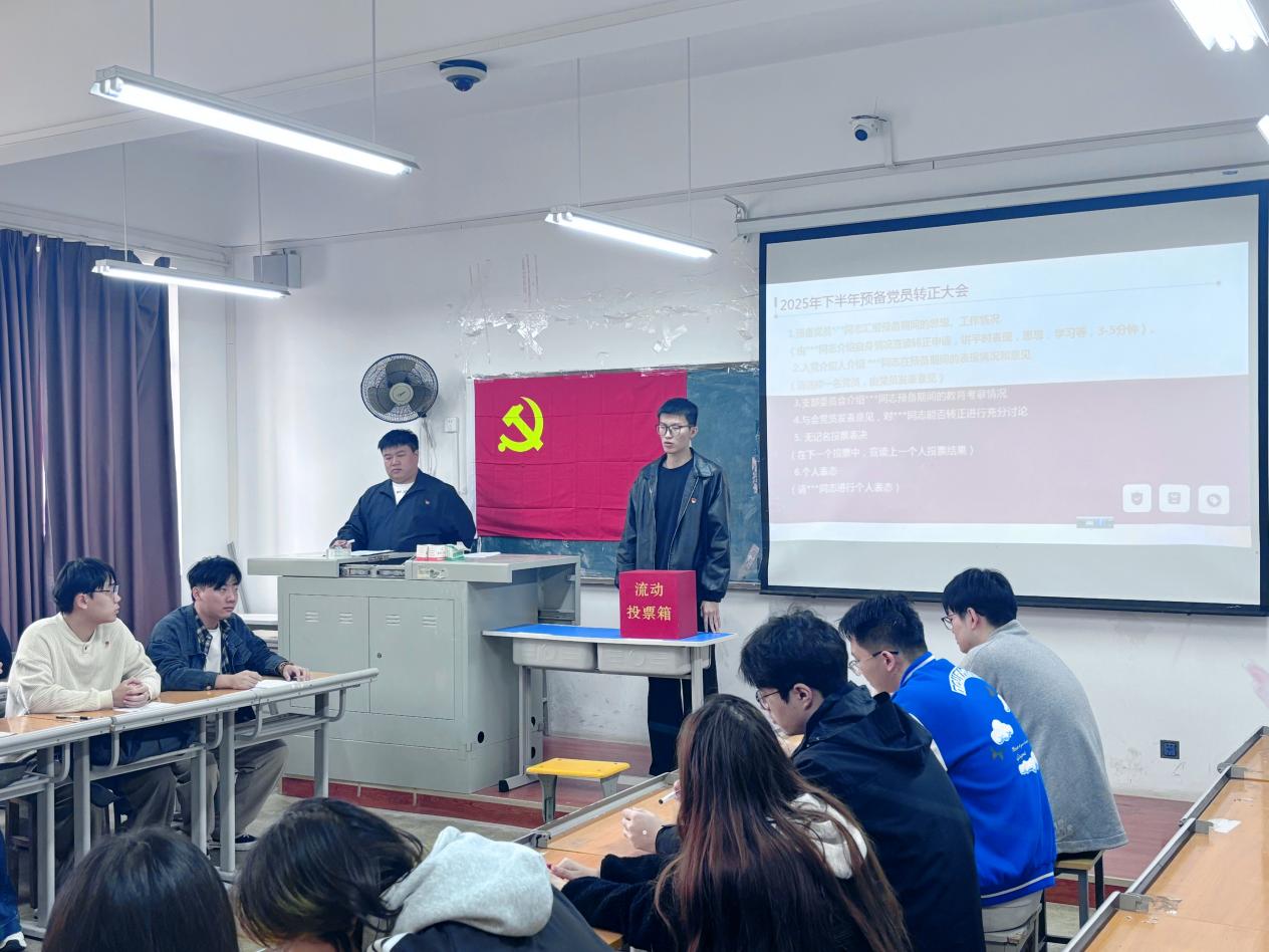 为严格党员发展程序,加强党员队伍建设。11月10日,艺术设计学院学生第一、第二党支部于2619、2617教室分别召开了2025年下半年预备党员转正大会,讨论预备党员樊飞阳等7名同志转为中共正式党员的相关事宜。会议分布由艺术设计学院学生第一党支部书记文宇良、第二党支部书记万颢桢同志主持,支部全体党员参加本次会议。