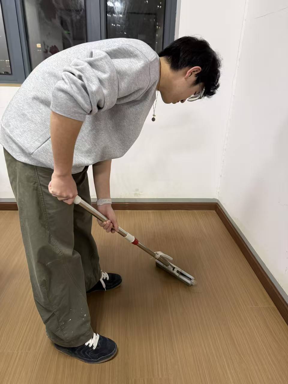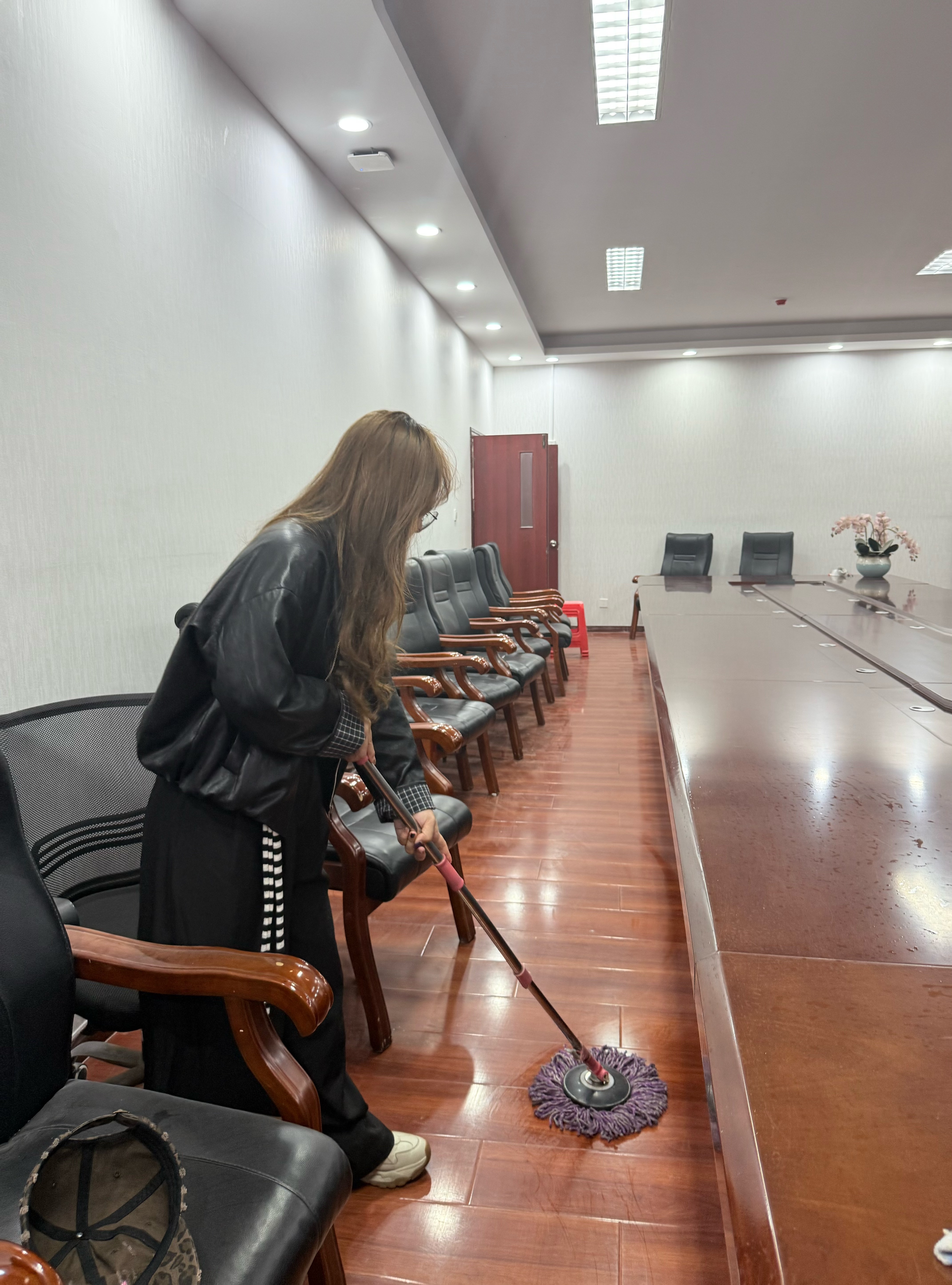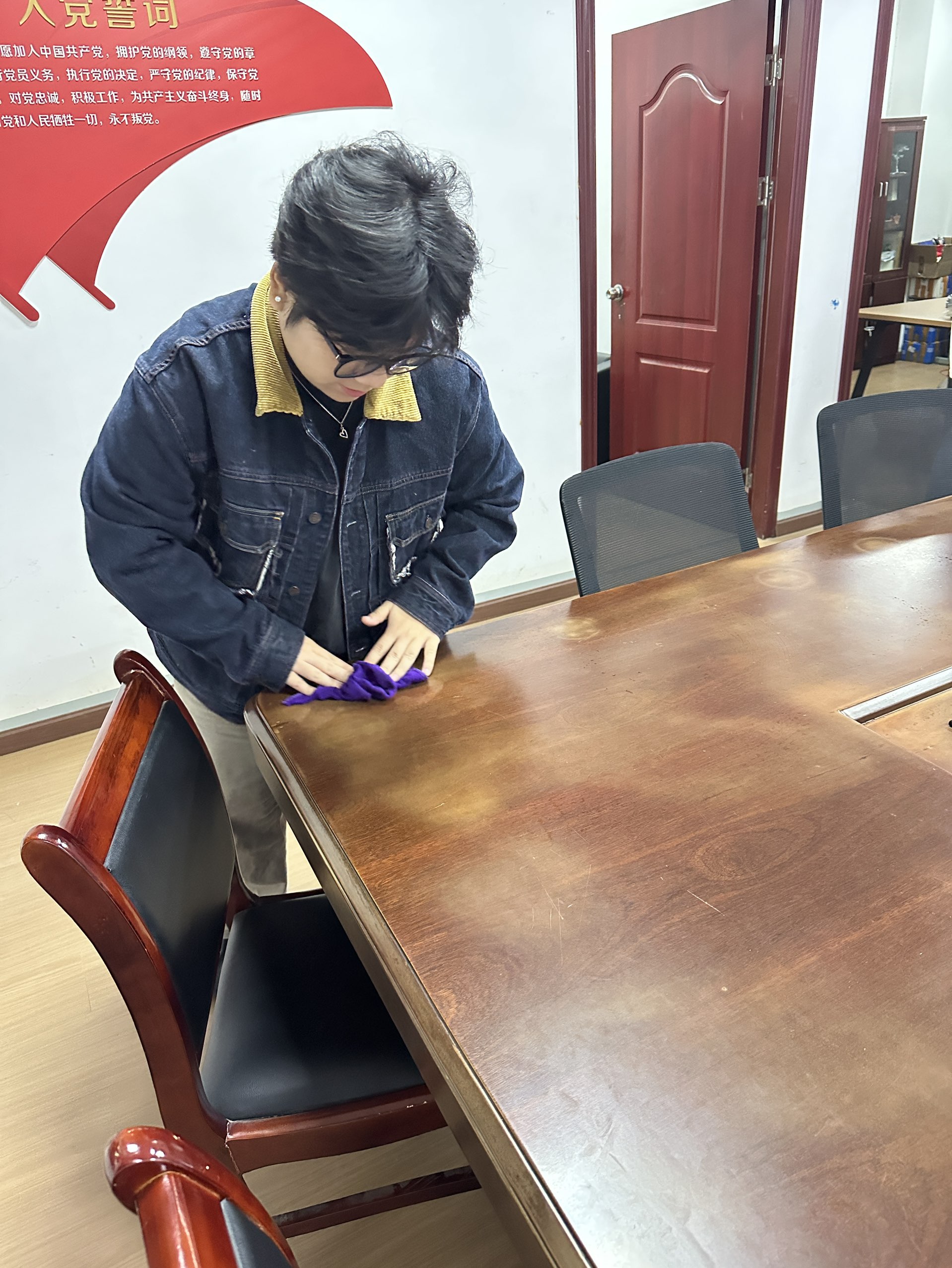 本次党课社会实践聚焦师生高频使用区域,将理论知识切实融入日常实践,进一步深化大家对党员义务的理解,以服务师生的实际行动锤炼党性、践行初心。活动现场,大家分工明确、干劲十足。有人手持抹布,仔细擦拭桌椅、窗台和文件柜,力求去除每一处积尘与污渍;有人拿起扫帚,认真清扫角落的杂物;还有人挥动拖把,反复拖净地面,让整个办公区域焕然一新。大家不怕脏、不怕累,以严谨细致的态度完成每一项清洁任务,用双手为老师和同学们营造了整洁舒适的办公与学习环境。