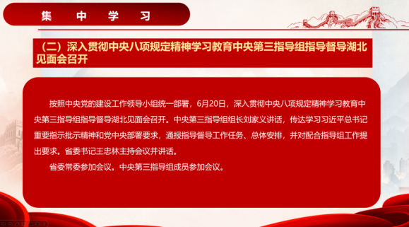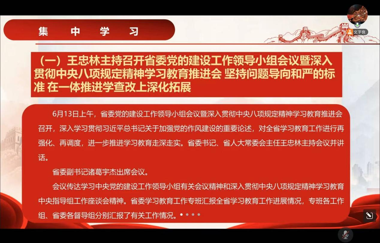 同时,结合6月13日省委书记、省人大常委会主任王忠林主持召开的省委党的建设工作领导小组会议暨深入贯彻中央八项规定精神学习教育推进会精神,重点传达“坚持严的基调、严的标准、严的措施贯穿始终”“在一体推进学查改上深化拓展”等要求,强调学院党员要深刻认识“党的作风关系人心向背、决定党和国家事业成败”,切实增强抓好学习教育的政治自觉、思想自觉和行动自觉。