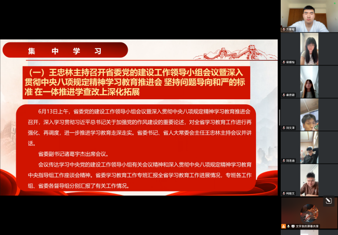 为深入学习贯彻习近平总书记关于加强党的作风建设的重要论述,推动中央八项规定精神学习教育走深走实,6月27日,艺术设计学院党总支以线上腾讯会议(会议号:274522516)形式,联合开展弘扬中央八项规定精神,深化“学查改”实践专题学习教育会。会议由艺术设计学院党总支书记喻佳同志主持,学院全体党员同志参会。