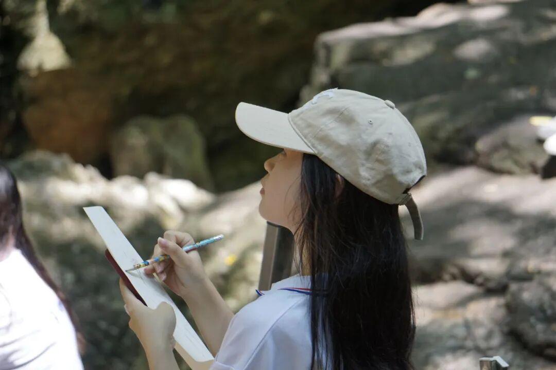 离开会议室,“艺”韵星澜暑期社会实践团的队员们即刻化身为“自然观察员”:循着蜿蜒山路探访古刹遗迹,在潭边驻足记录水流光影,于密林间捕捉花鸟形态……每一片叶的纹路、每一声泉的叮咚,都化作了灵感的种子。“你看这山的轮廓,能不能融入书签设计?”“潭水的蓝绿渐变,做成丝巾一定很绝!”热烈的讨论声在山水间回荡,一个个将三潭之美“打包带走”的文创构想,正悄然酝酿、渐趋成形。