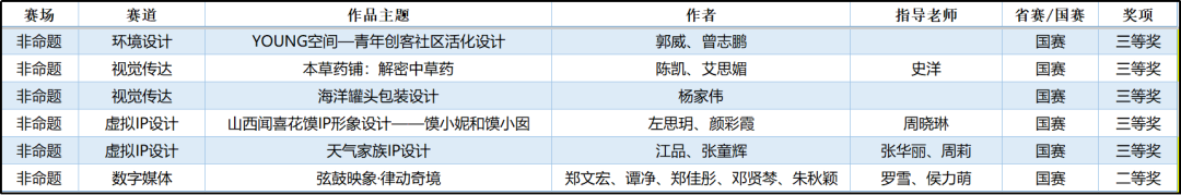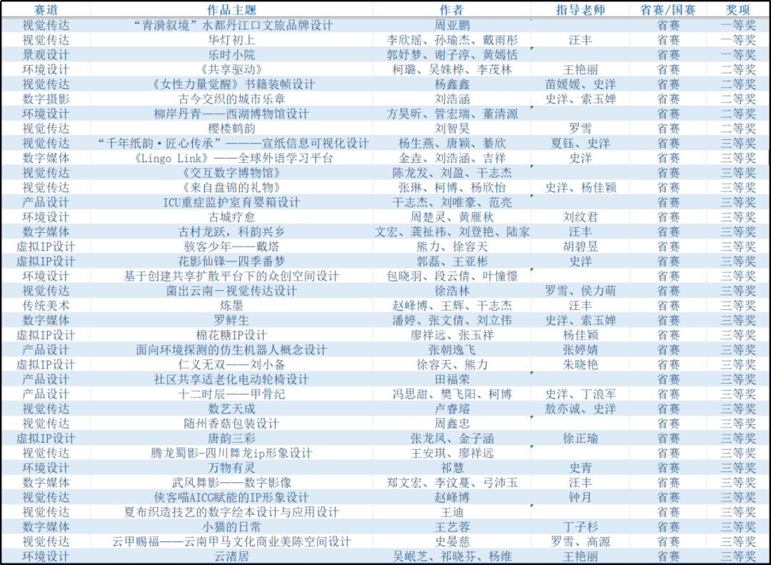 在非命题赛道省级赛事中,夏珏老师《梦境与梦想》系列插画获教师组视觉传达省级三等奖,我院学子同样表现亮眼,共获得37余项奖项,包括一等奖3项、二等奖5项、三等奖29余项,充分展示了我院在设计领域的强大实力。具体获奖名单如下: