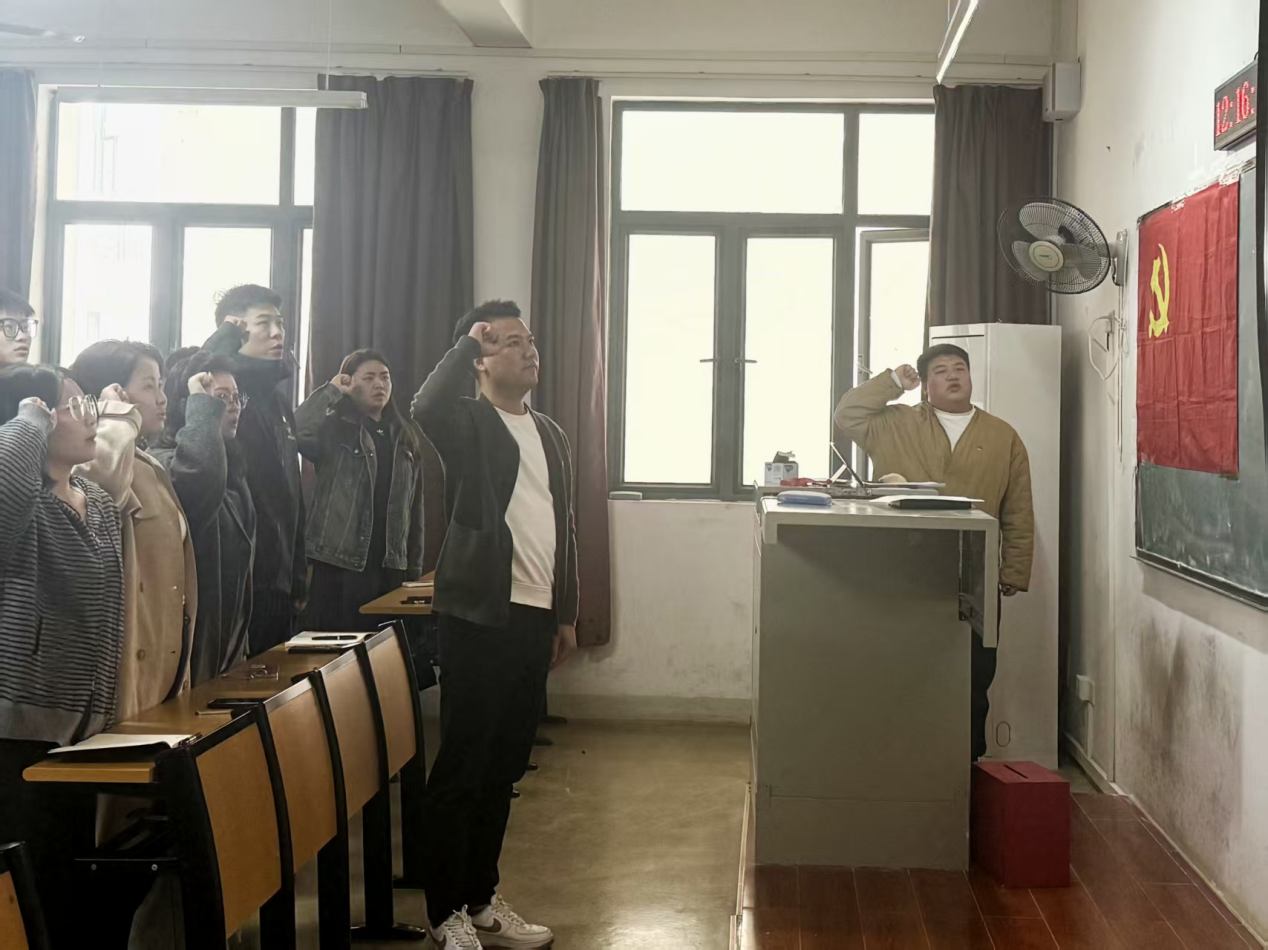 会议伊始,支部书记通报了党员到会情况及本月党费缴纳情况。全体党员肃立奏唱国歌,紧接着由学生第二党支部纪检委员丁浪军同志带领全体党员重温入党誓词。