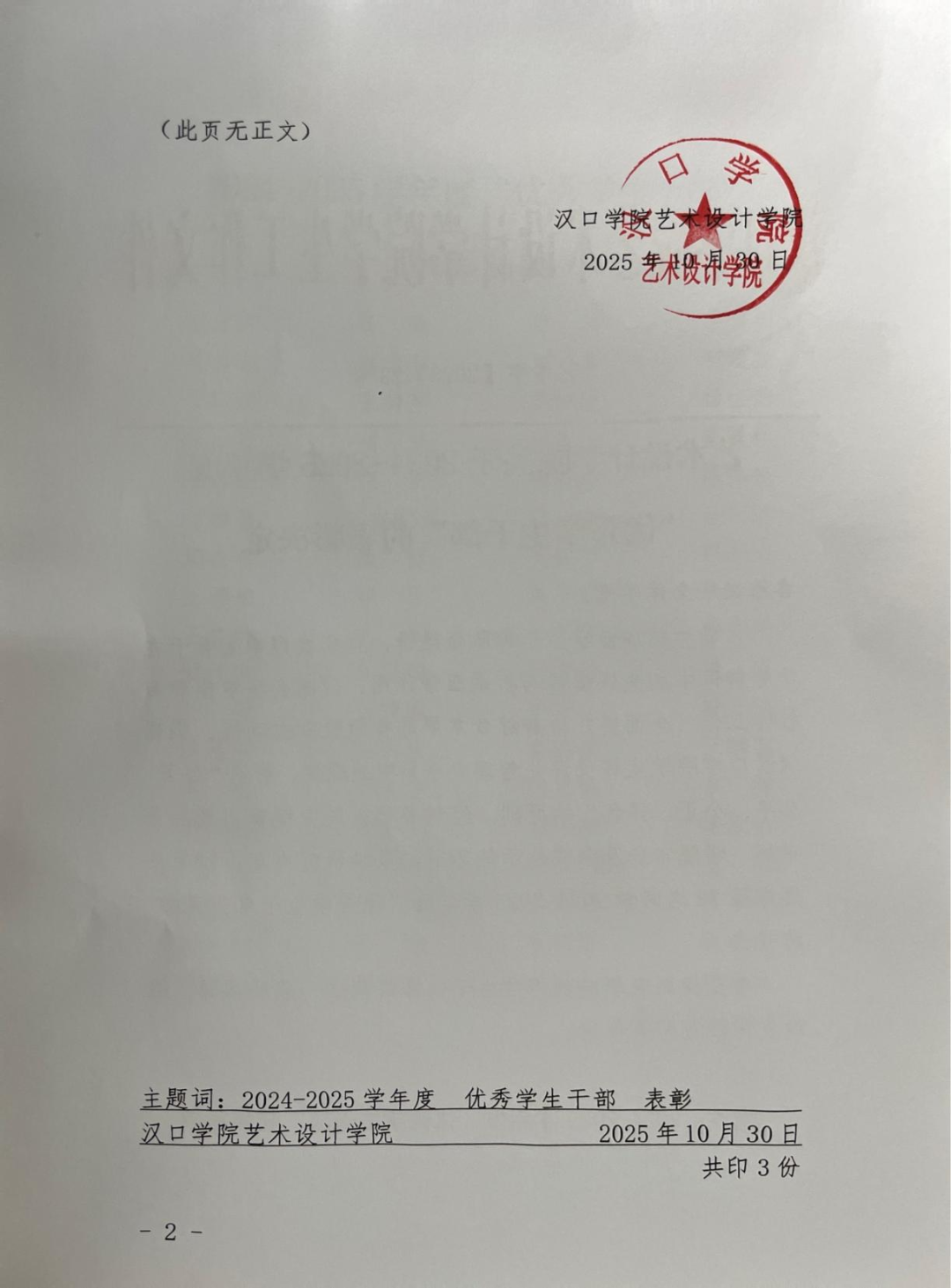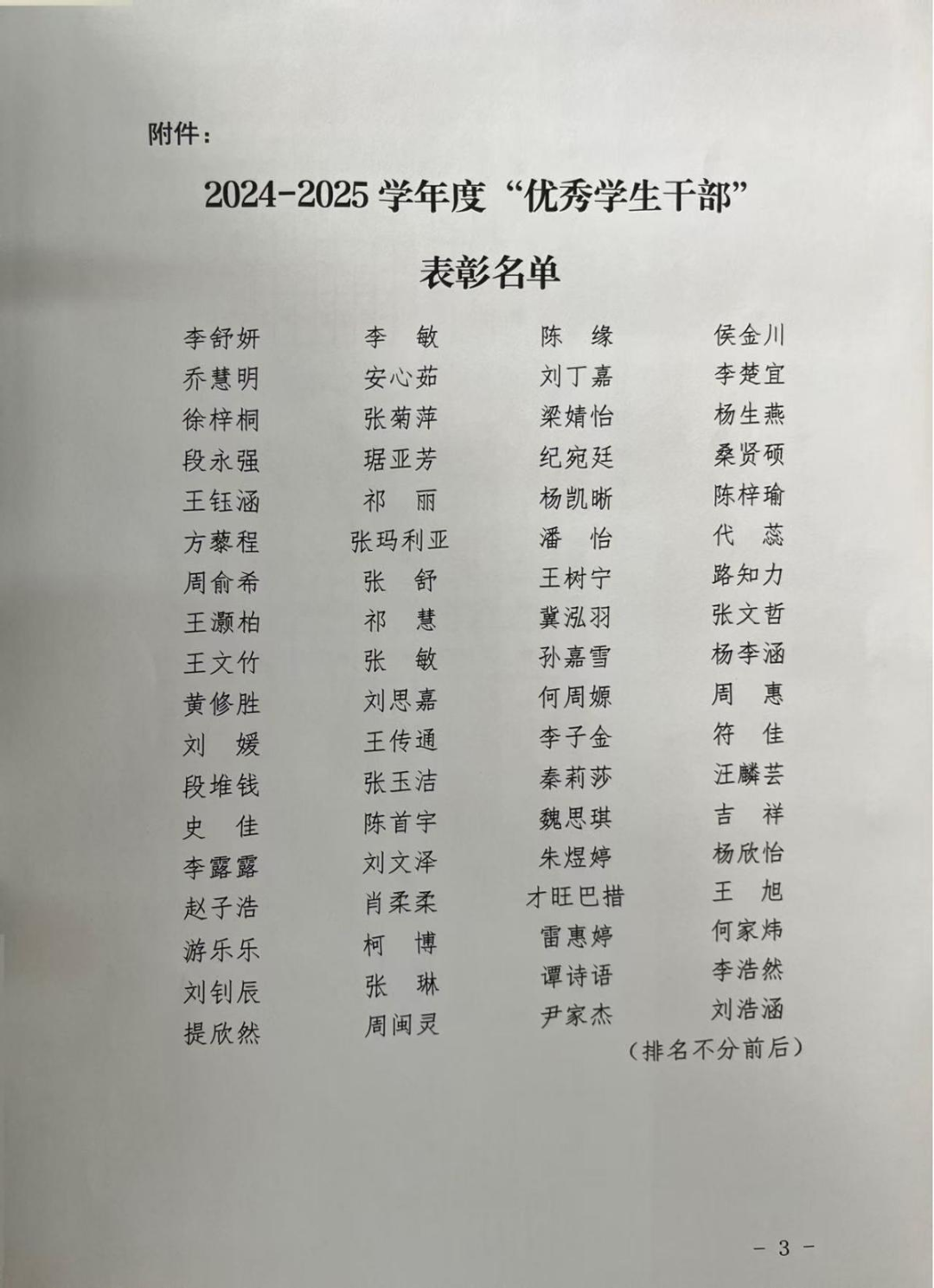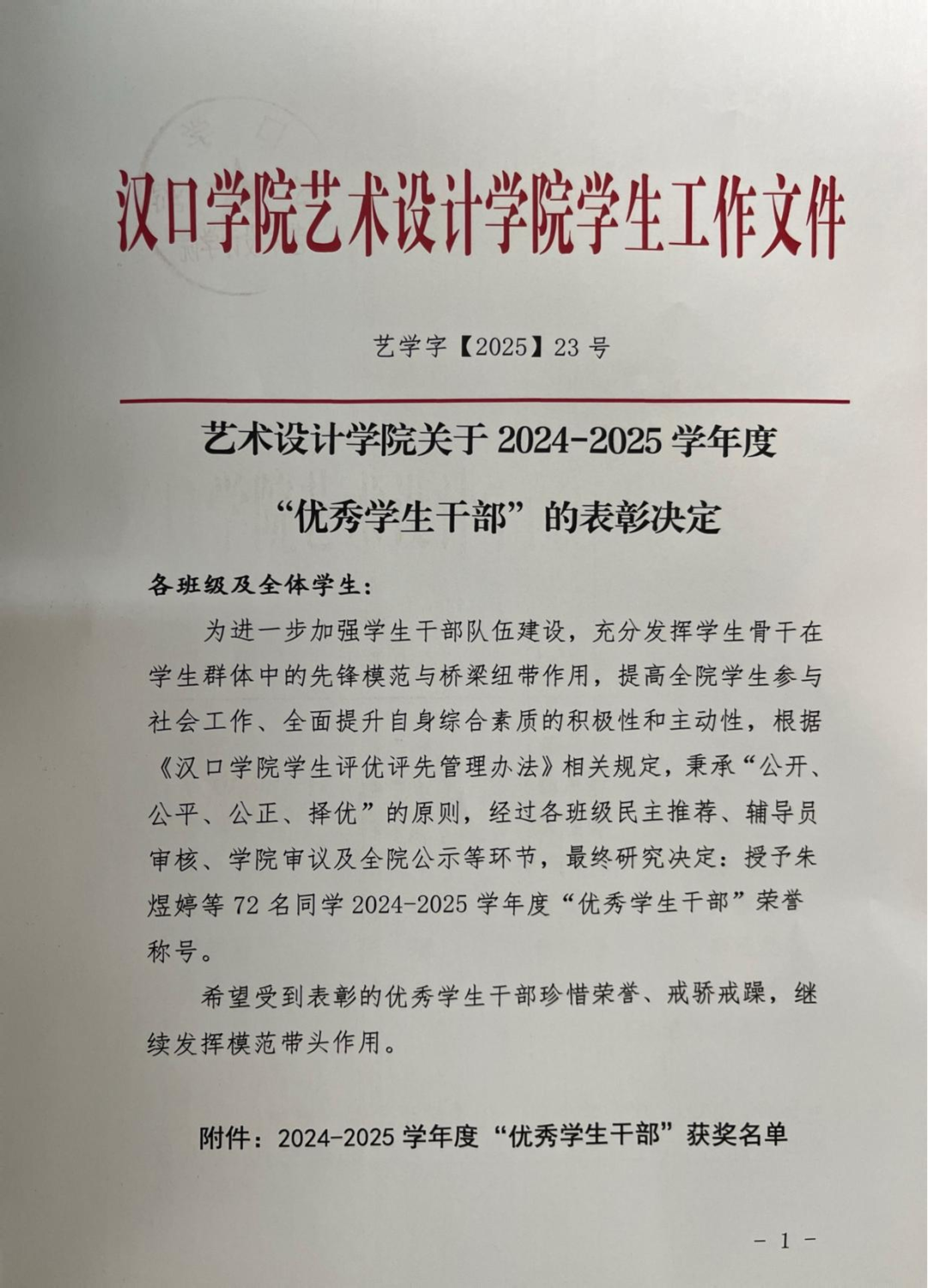 根据《汉口学院学生评优评先管理办法》相关规定,经过各班级民主推荐、辅导员审核、学院审议等各项环节,授予我院72位同学2024—2025学年度“优秀学生干部”称号,现将表彰名单予以公告。