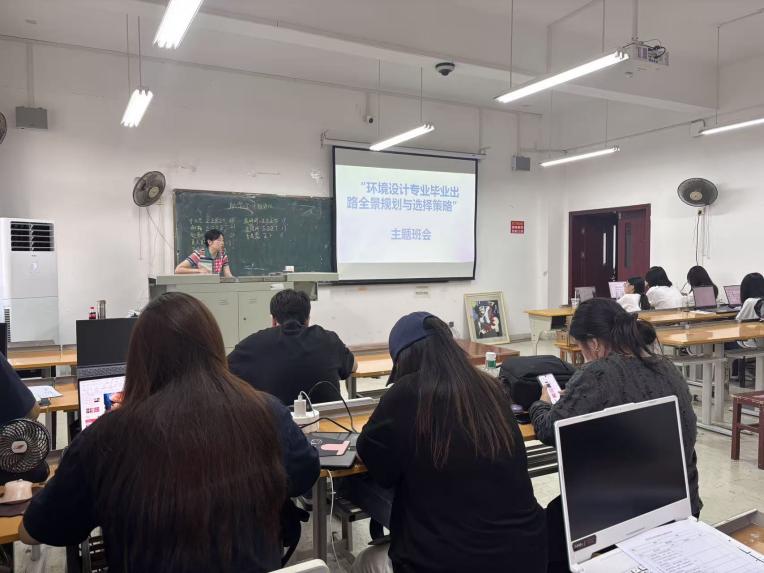 为助力艺术设计学院2022级环境设计专业2班学生清晰规划毕业方向,班主任张枞老师10月9日在二教2617开展了“环境设计专业毕业出路全景规划与选择策略”主题班会,从就业、考研、考公、创业四大维度,为同学们拆解路径、剖析挑战、提供策略,为即将面临毕业选择的学子们提供全面指导。