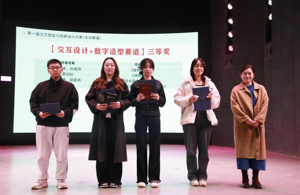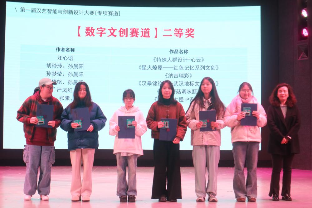 实力选手凭借出众创意与扎实功底脱颖而出,将现场氛围推向高潮。视觉传达、数字动效、人居设计、数字造型、艺术设计、数字文创、命题赛道等选手脱颖而出。汉口学院艺术设计学院教学副院长王昆、科研副院长郑昱、院学术委员会委员王军平、院教学督导办主任张华丽副、办公室主任史洋依次为获奖选手颁奖并定格瞬间,现场掌声不断,氛围热烈。这一环节不仅是对选手们专业能力的肯定,更彰显了大赛多元融合的设计导向。