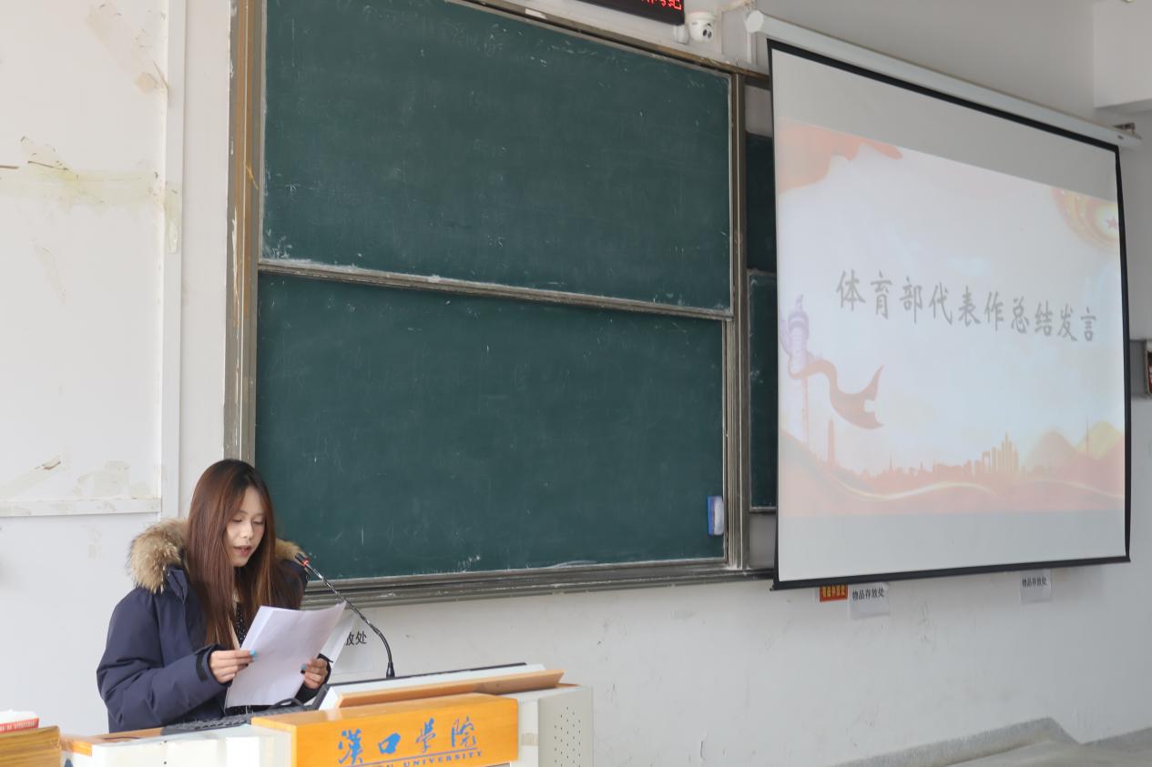 体育部代表晁弋夕发言:她表示,体育部的工作重心聚焦于各类体育活动与赛事的策划、组织与执行,全程负责活动赛事的筹备、现场协调等各项工作。后续部门将继续凝聚团队合力,统筹协调各类人员,策划并举办更具艺术设计学院特色的体育活动,丰富同学们的课余体育生活。