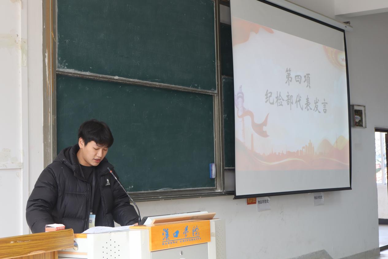 纪检部代表刘文泽发言:围绕纪检部监督执纪、规范管理的核心职责,对部门未来工作开展规划作出详细阐述。他郑重表态,后续工作中将秉持公正严谨的工作态度,严守原则底线,针对学生组织纪律执行、干部履职情况等方面开展常态化监督,同时主动收集学生意见建议,切实履行监督职责,为学院学生组织的规范化运行保驾护航。