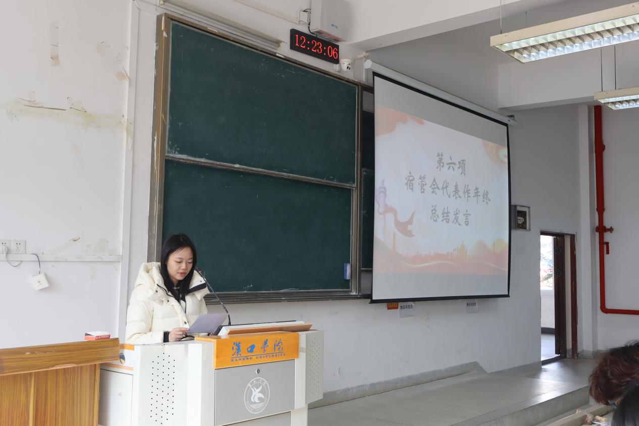 第八项:宿管会指导老师杨艺发言:她首先对全体学生干部的辛勤付出表示感谢,随后展望了后续工作计划,提出将持续做好学生工作的服务保障,聚焦学院宿舍环境与文化氛围建设,同时在活动筹备、后勤保障等工作上持续发力,力争实现工作质量与服务水平的双提升。