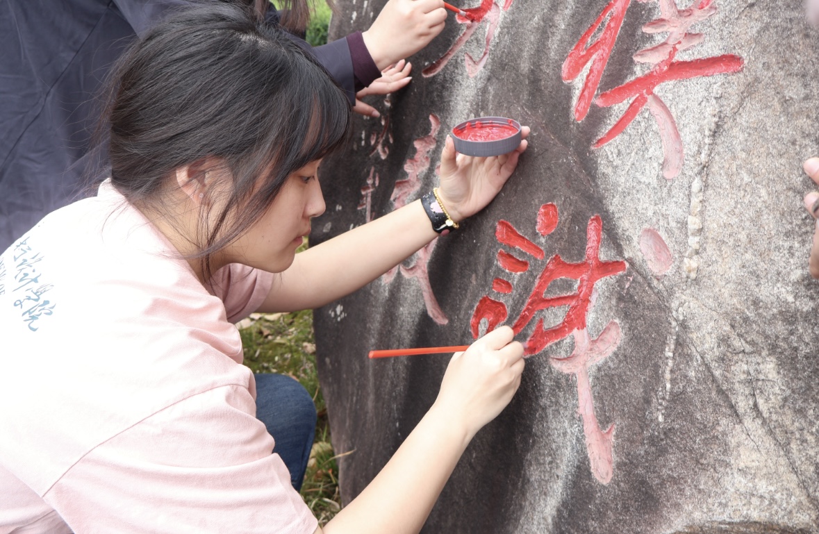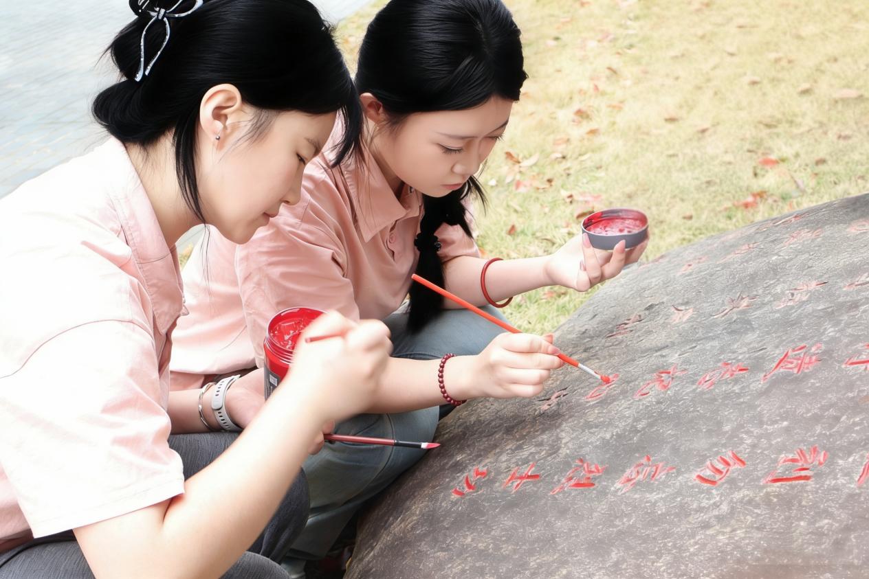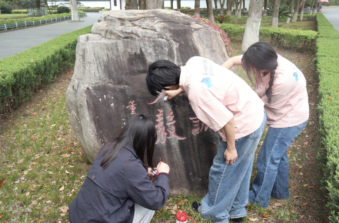 祭扫不仅是一种形式,更是一次心灵的洗礼。活动中,师生们与驻村工作队员一同怀着无比崇敬的心情,细致清理烈士陵园。他们俯身擦拭每一块墓碑上的灰尘,拔除周围的杂草,清扫散落的落叶。阳光下,经擦拭后的墓碑碑文显得格外鲜红。随后,学生们手持毛刷、红漆等工具,认真为碑文描红补色,一笔一划地拓印、誊写碑文,指尖轻触斑驳的文字,仿佛在与历史进行跨越时空的对话。